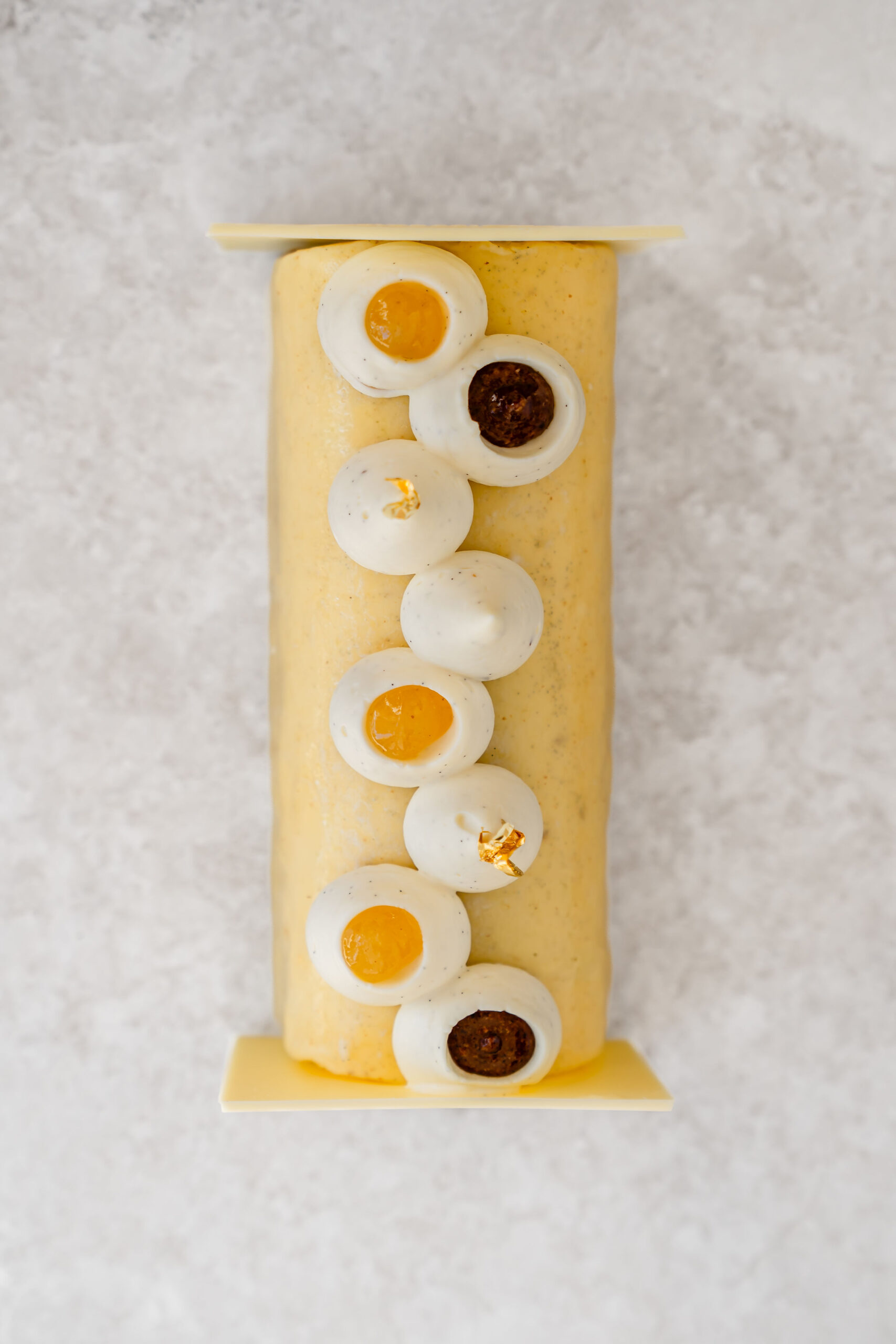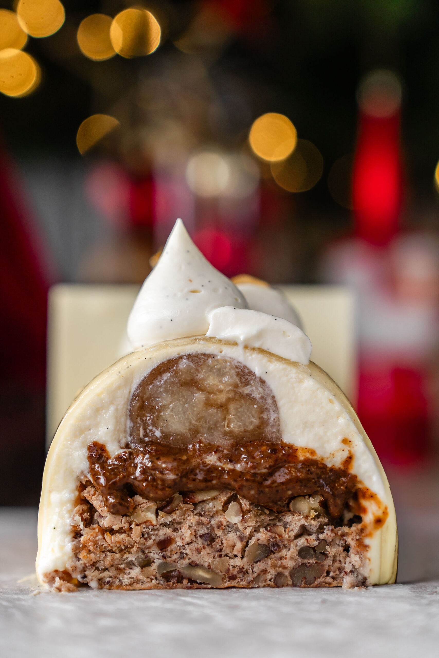 Une base de biscuit avec éclats de noix de pécan, un croustillant pécan, un cœur au doux parfum de poire, de vanille et de cannelle et enfin un praliné pécan coulant. Le tout est enrobé de la douceur d’une mousse légère parfumée à la vanille de Madagascar.
