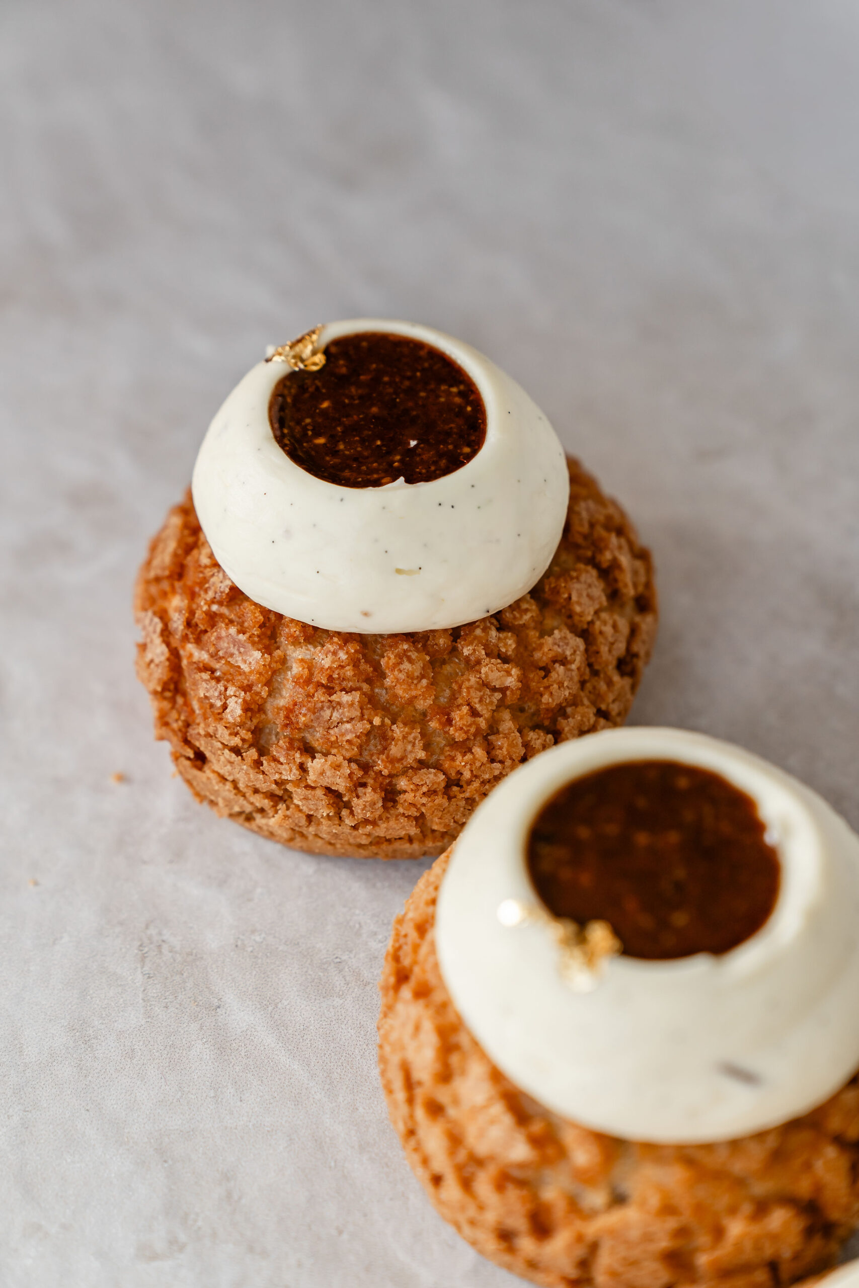 Chou, craquelin, crème onctueuse à la vanille, praliné pécan.