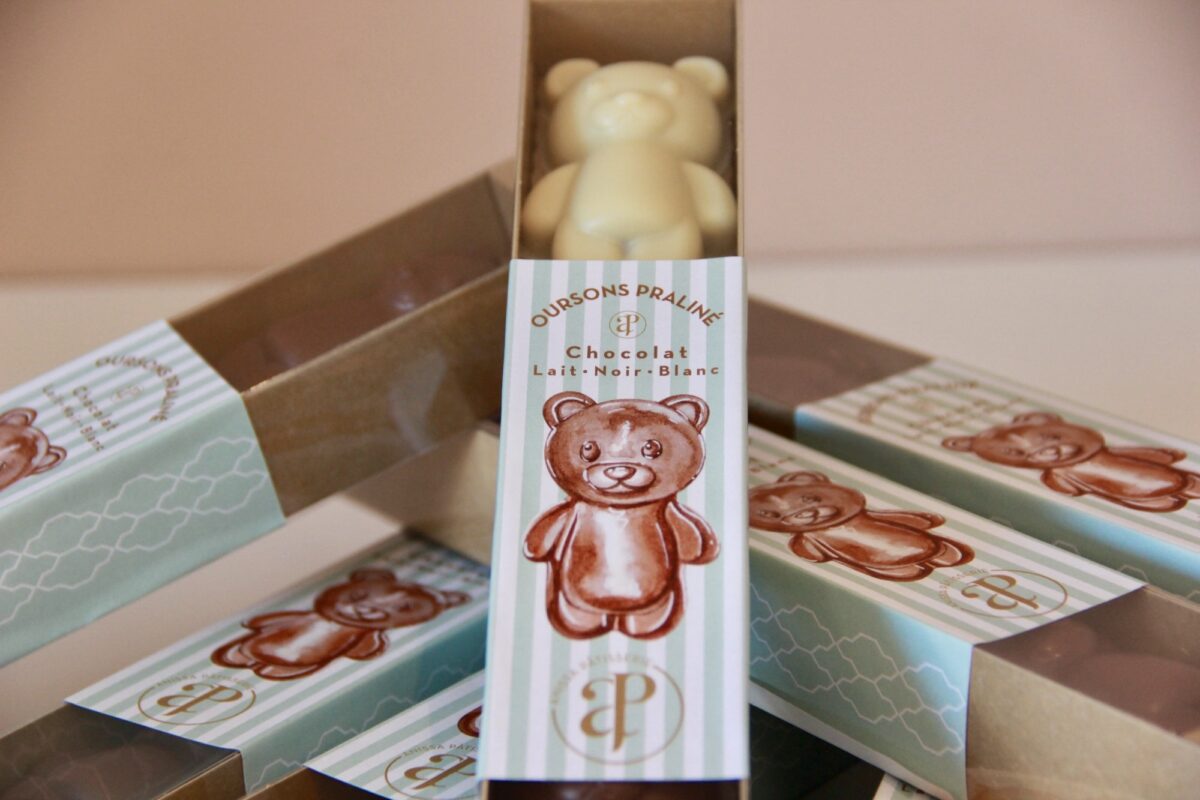 Retour en enfance au travers de ces délicieux oursons en chocolat noir, lait et blanc, fourrés au praliné maison, réalisé à partir de sucre de coco. .