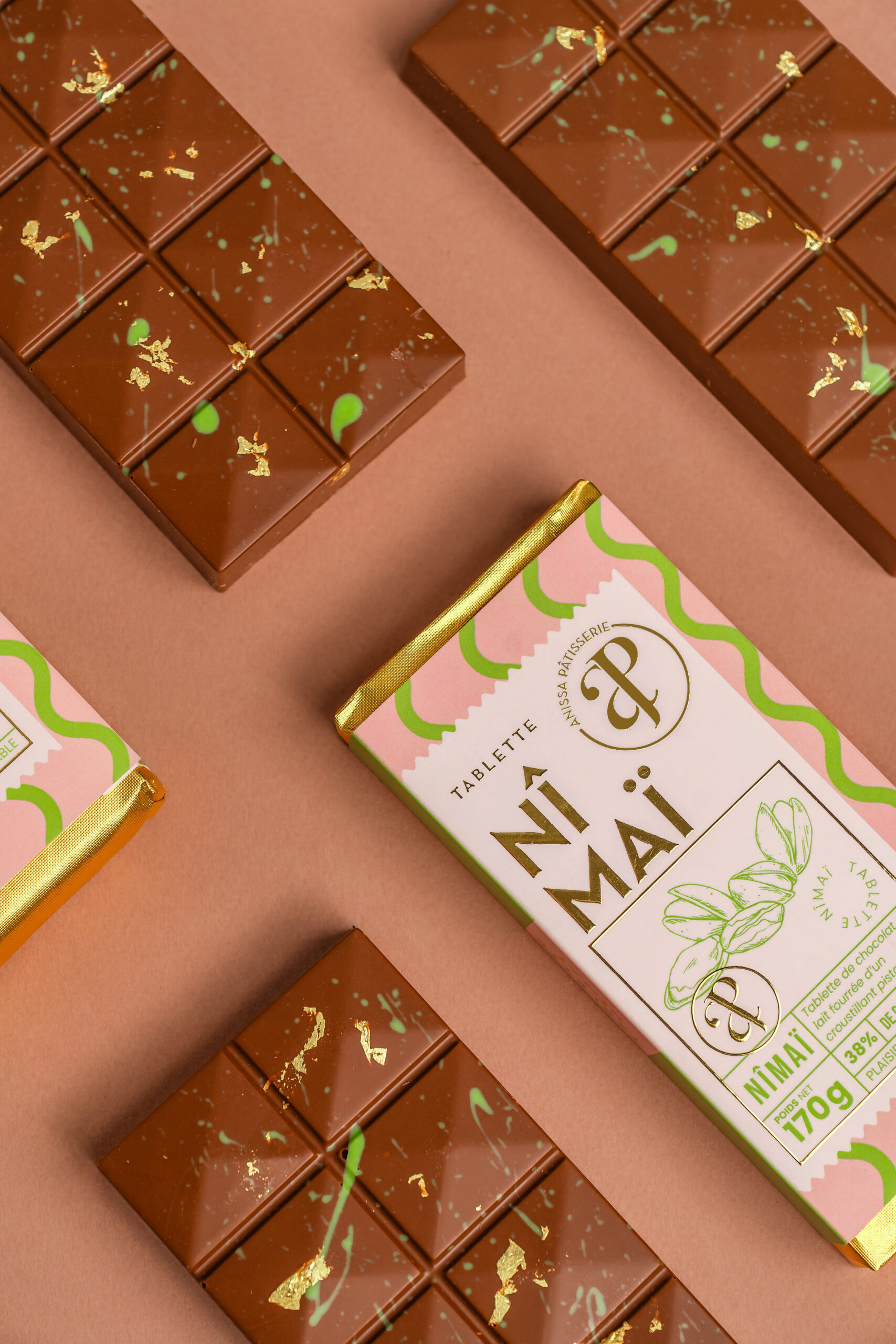 Tablette de chocolat au lait fourrée d’un croustillant pistache.
